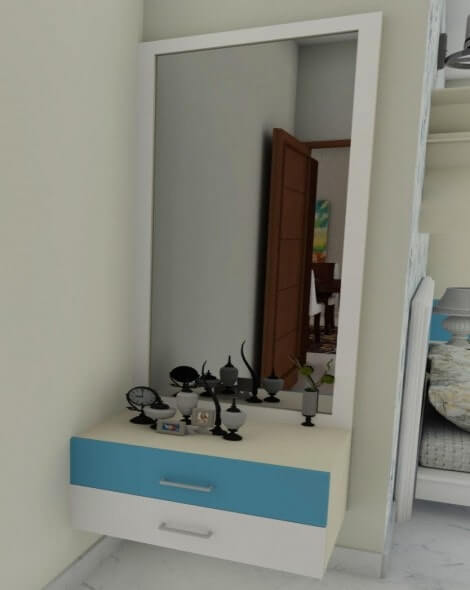At Interior studio, we design the dressing tables with supreme quality hard wood from premium brands that is durable for long years keeping the strength up. To accompany this we can add full length mirrors, closet style mirrors or hal-mirrors of your choice with different racks to store your makeup and essentials. Get you customaized dressing unit as you desired to fit into your beautiful home.