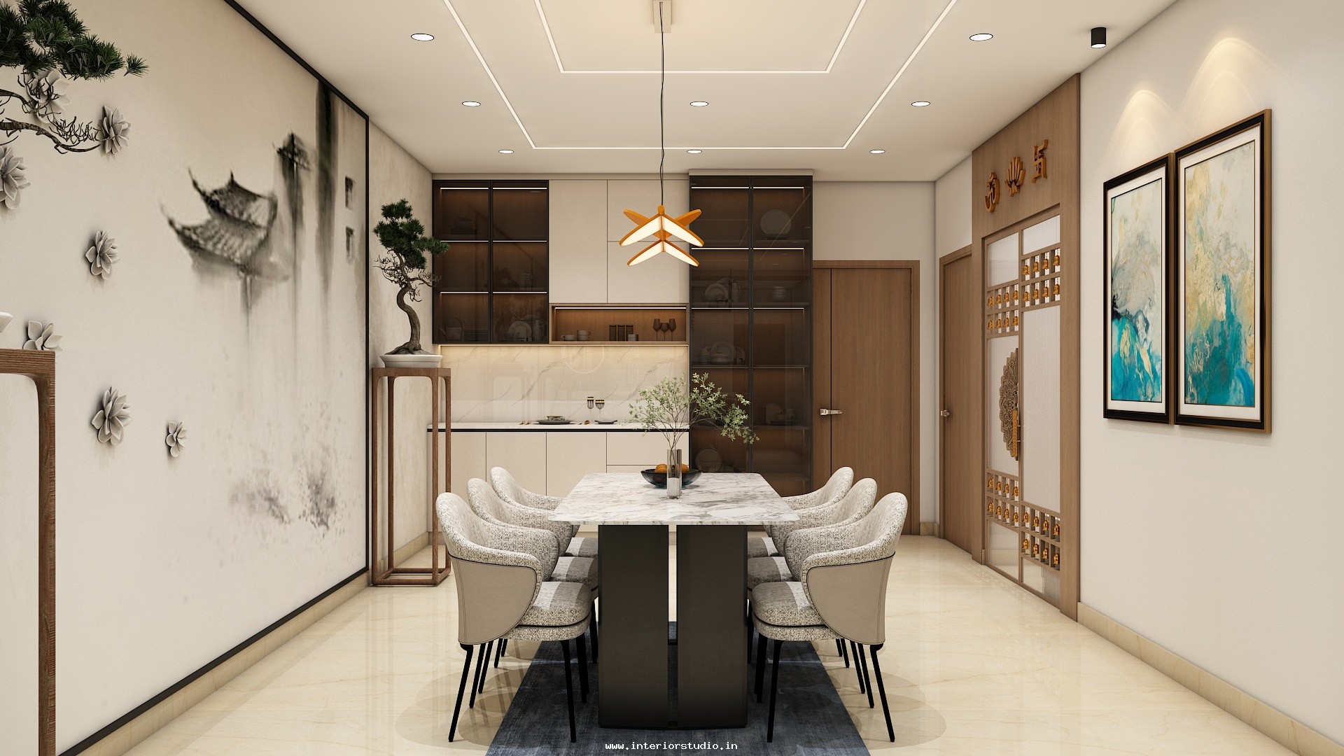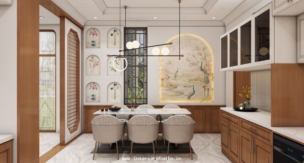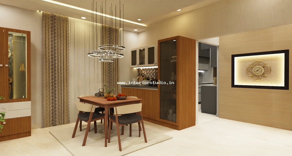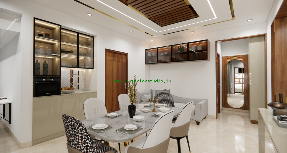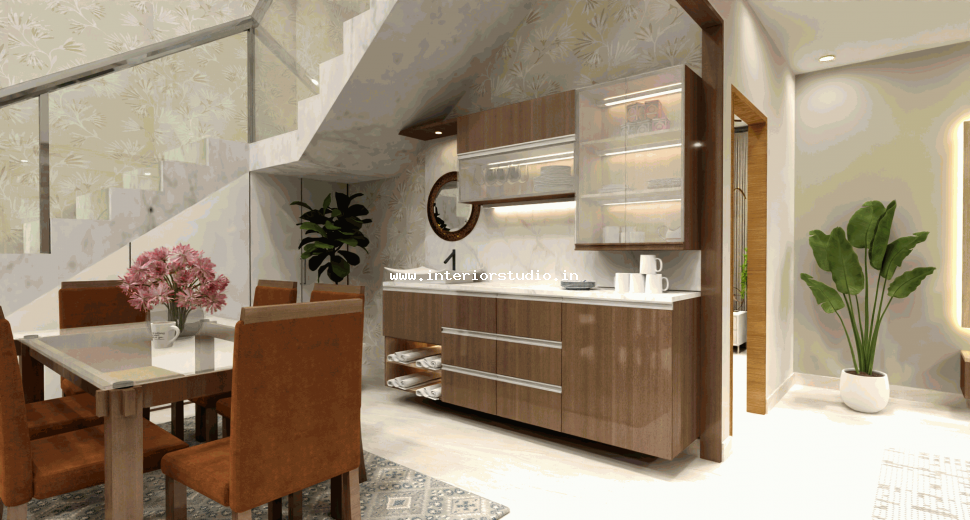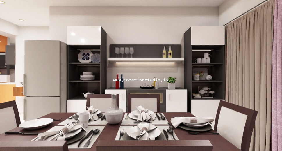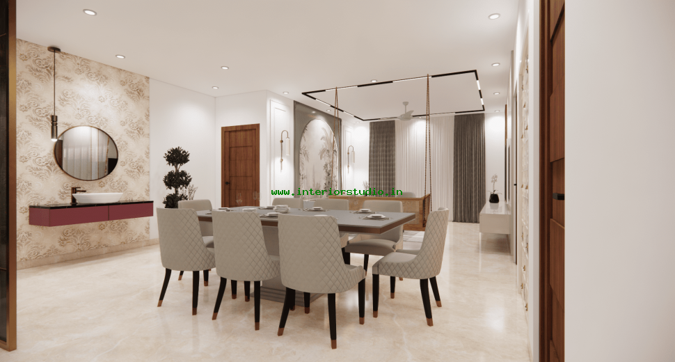 Dining room with perfect interior design can create more functional space for family gatherings. Our 3D interior design of dining room represents the detailed layout of the seating arrangement & dining table with round, rectangle and other styles. Lightings like pendant lights over the table create a warm ambiance, sideboard for buffet cabinet & storage of dinnerware and some other decorative items like wall art, mirrors etc. are included in our 3D design.
