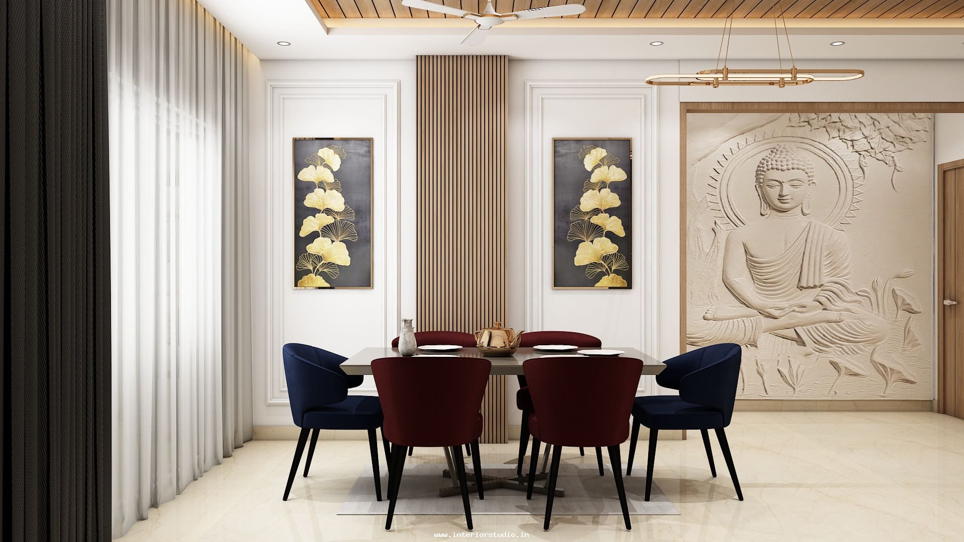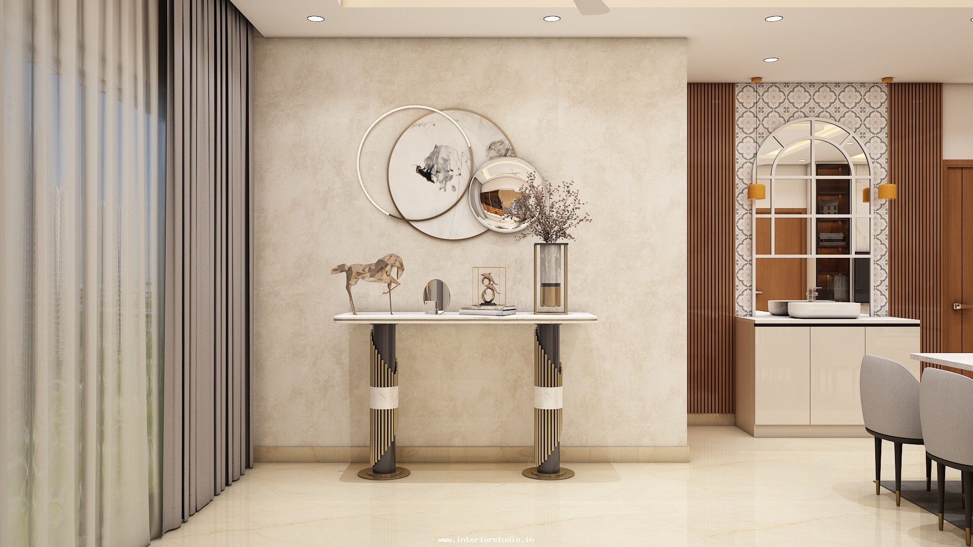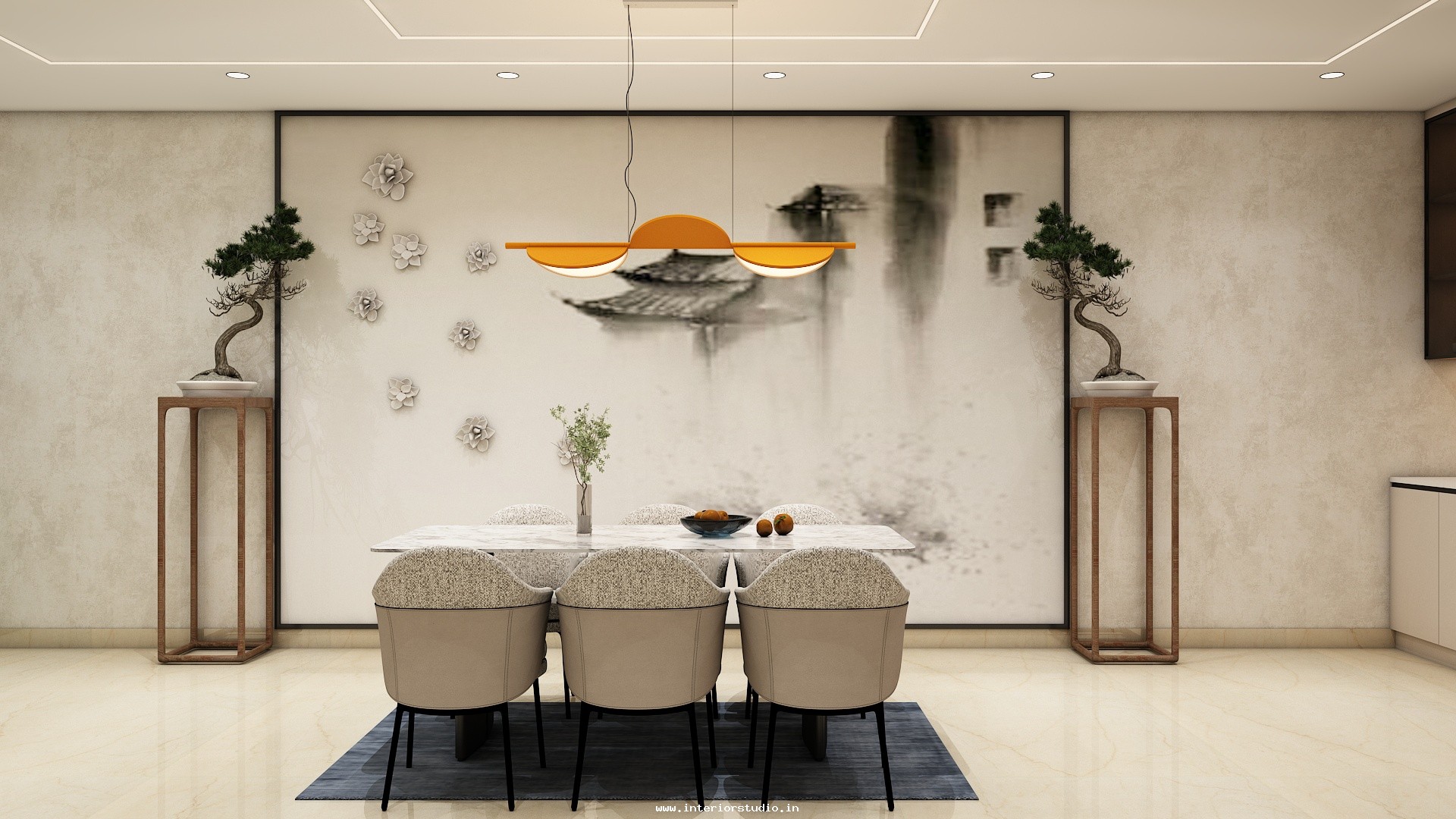 Dining room with perfect interior design can create more functional space for family gatherings. Our 3D interior design of dining room represents the detailed layout of the seating arrangement & dining table with round, rectangle and other styles. Lightings like pendant lights over the table create a warm ambiance, sideboard for buffet cabinet & storage of dinnerware and some other decorative items like wall art, mirrors etc. are included in our 3D design.