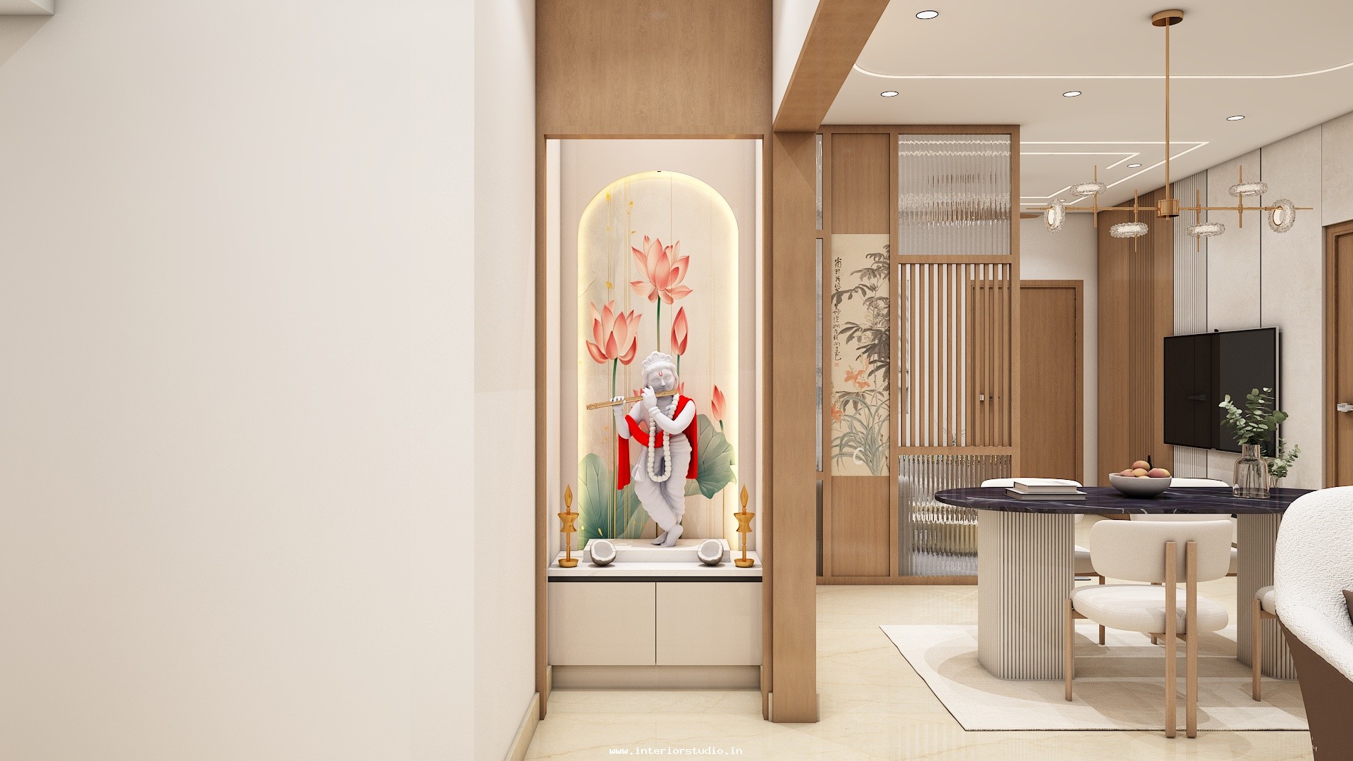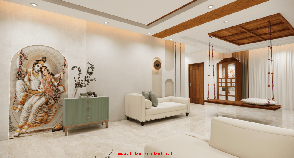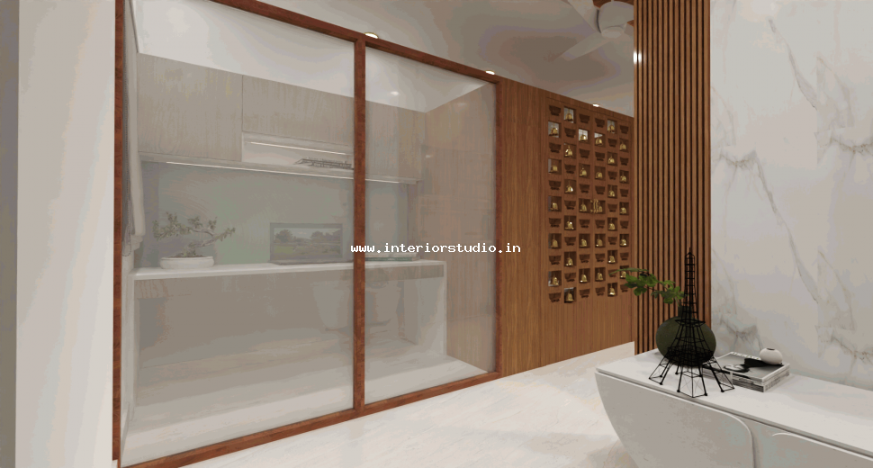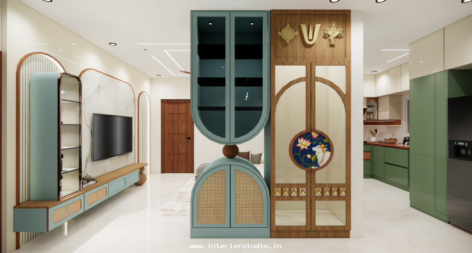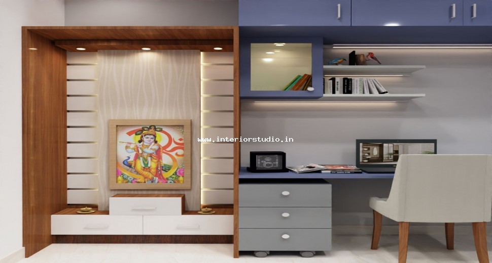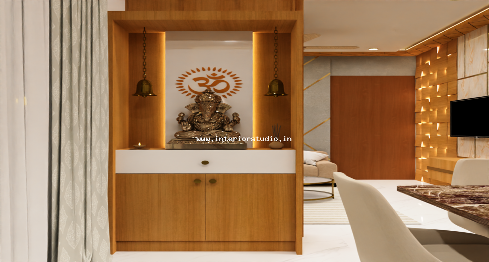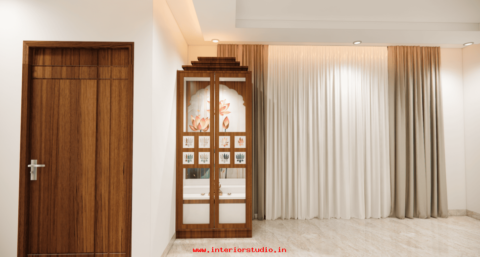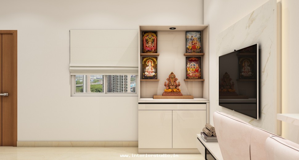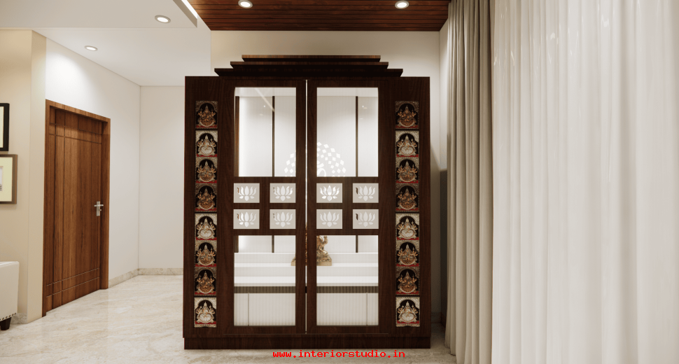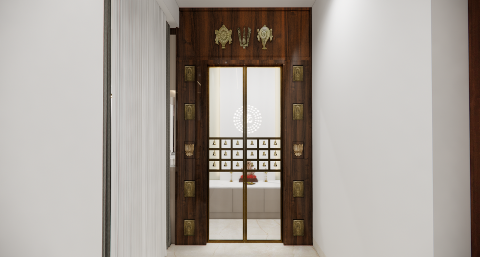 Pooja room is where we can find some peace of mind regularly at our homes. So, this room needs to get more space and a clean look to have a peaceful pooja everyday. Our 3D design of the Pooja room represents the Altar Setup with more space for idols, deity photos along with shelves for lamps and other pooja essentials. Also, lighting with LED backlights to bring the glow of pooja mandir, ventilation to make the fog from diyas to spread out along with speakers for playing chants or devotional music and traditional pooja items are added to the room making it more authentic.