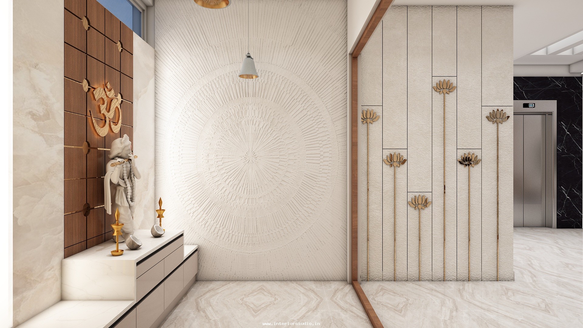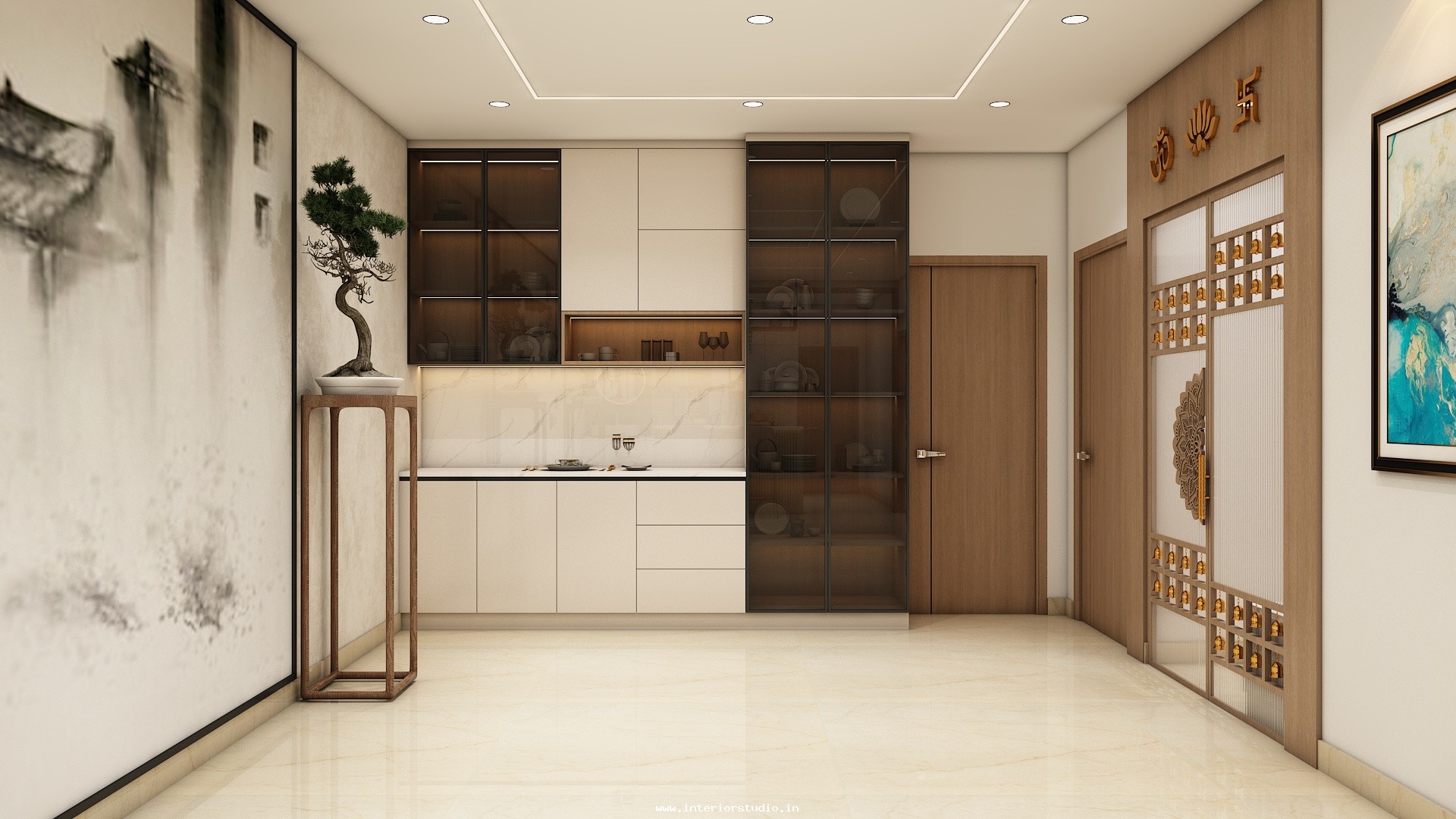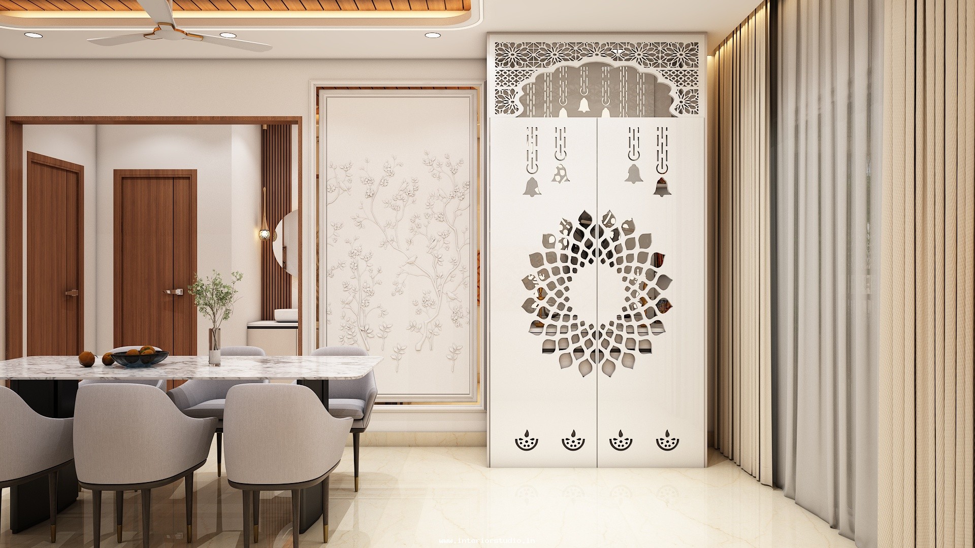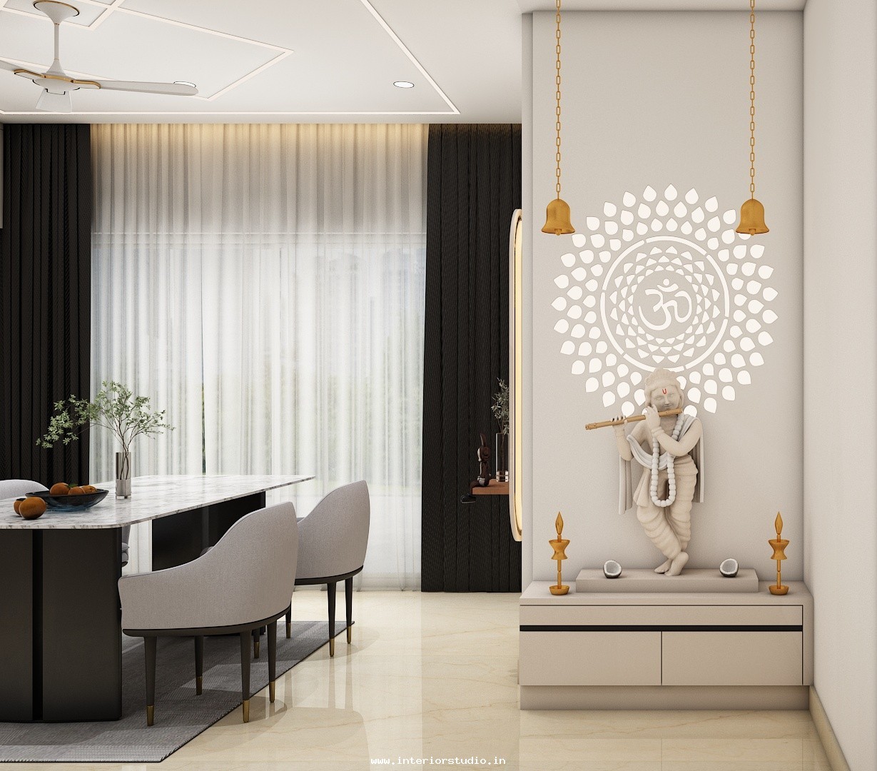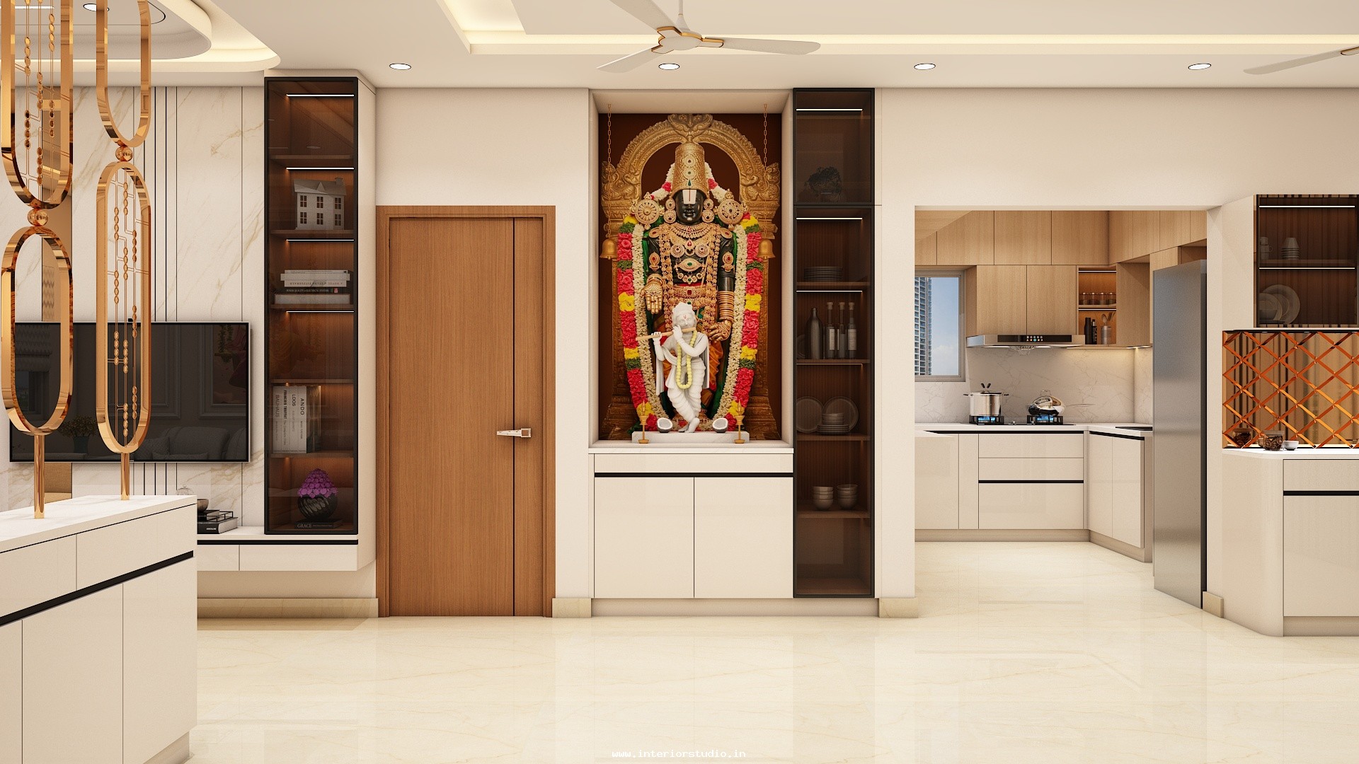 Pooja room is where we can find some peace of mind regularly at our homes. So, this room needs to get more space and a clean look to have a peaceful pooja everyday. Our 3D design of the Pooja room represents the Altar Setup with more space for idols, deity photos along with shelves for lamps and other pooja essentials. Also, lighting with LED backlights to bring the glow of pooja mandir, ventilation to make the fog from diyas to spread out along with speakers for playing chants or devotional music and traditional pooja items are added to the room making it more authentic.