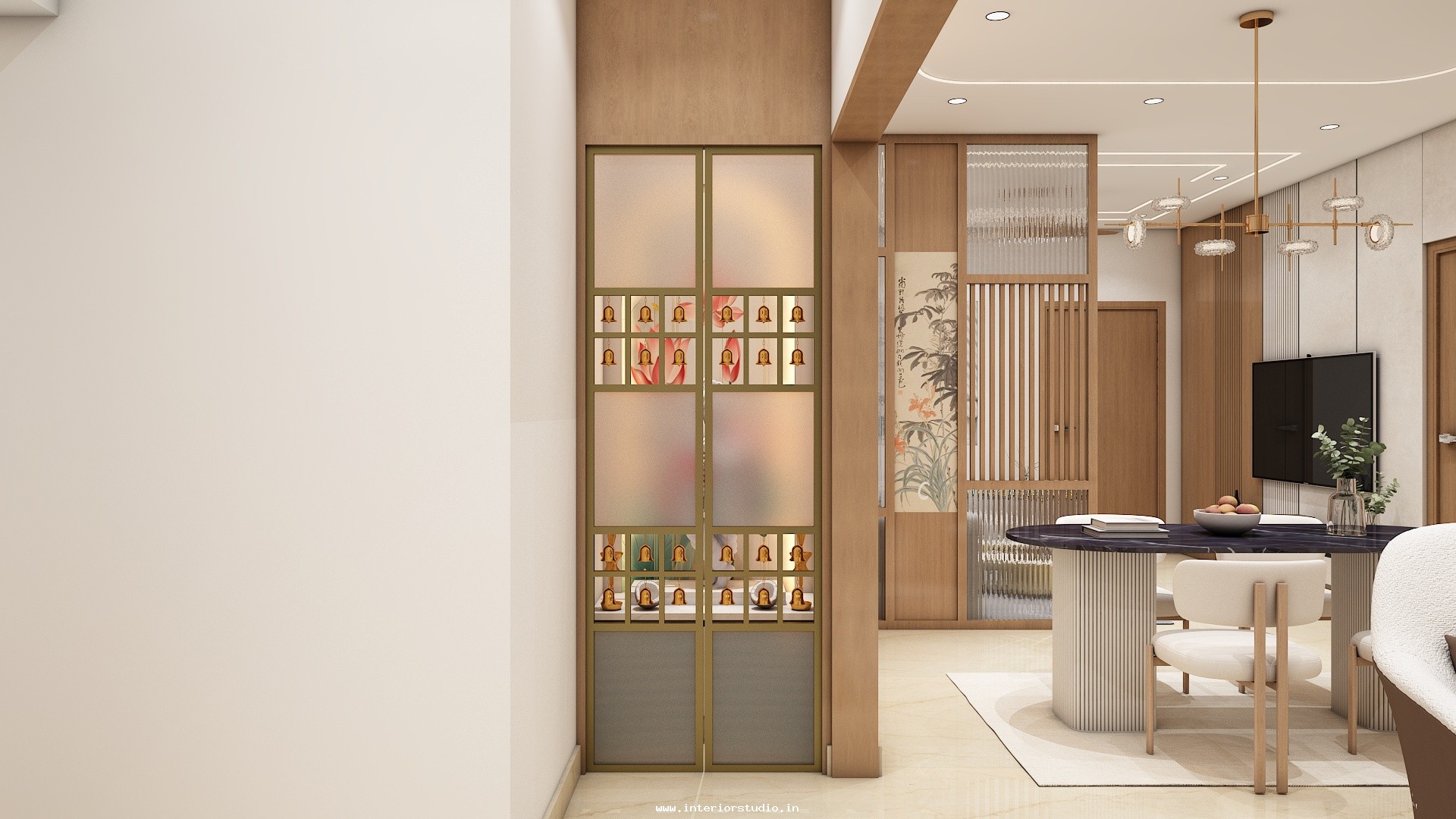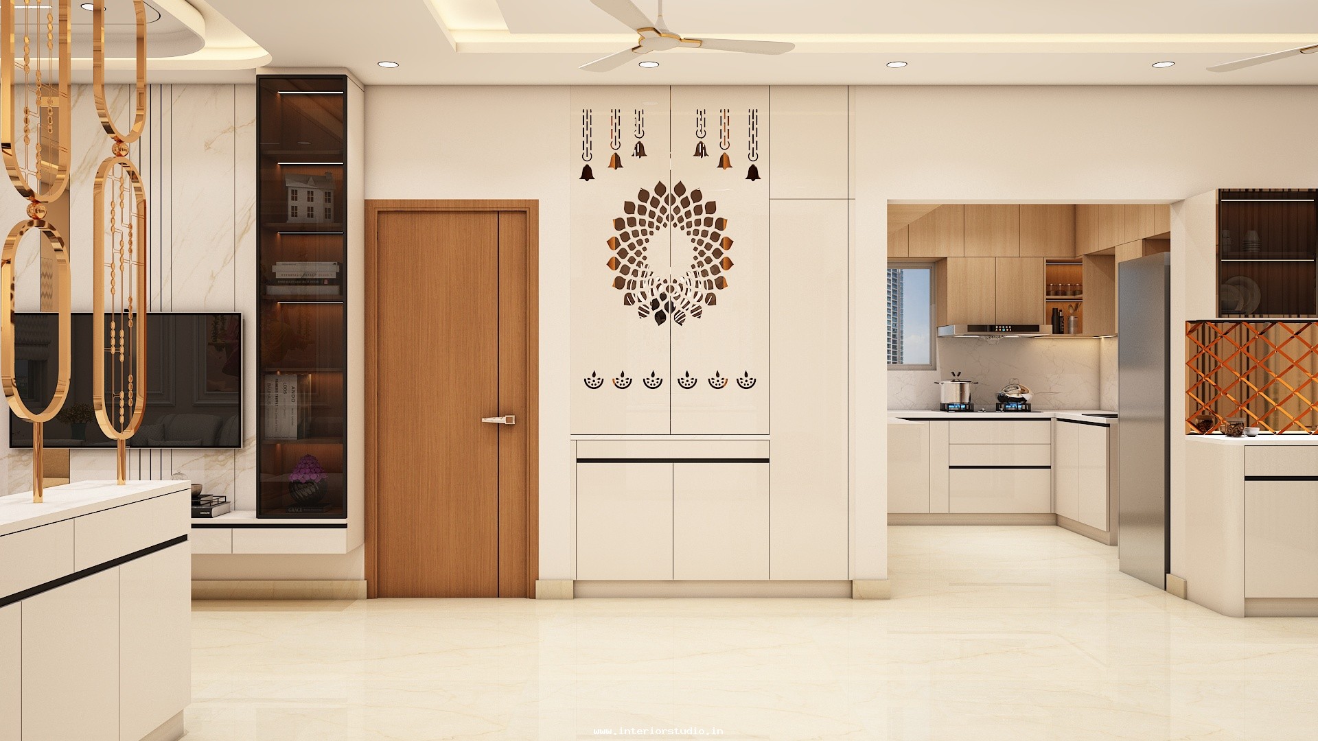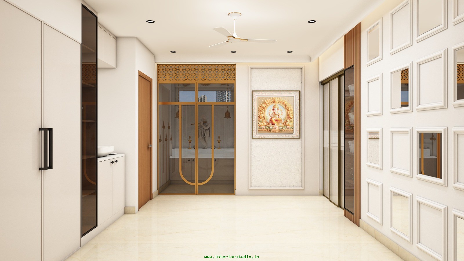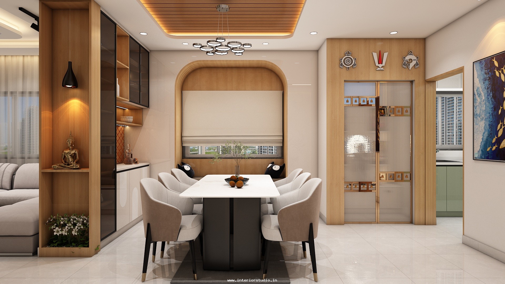 Pooja room is where we can find some peace of mind regularly at our homes. So, this room needs to get more space and a clean look to have a peaceful pooja everyday. Our 3D design of the Pooja room represents the Altar Setup with more space for idols, deity photos along with shelves for lamps and other pooja essentials. Also, lighting with LED backlights to bring the glow of pooja mandir, ventilation to make the fog from diyas to spread out along with speakers for playing chants or devotional music and traditional pooja items are added to the room making it more authentic.