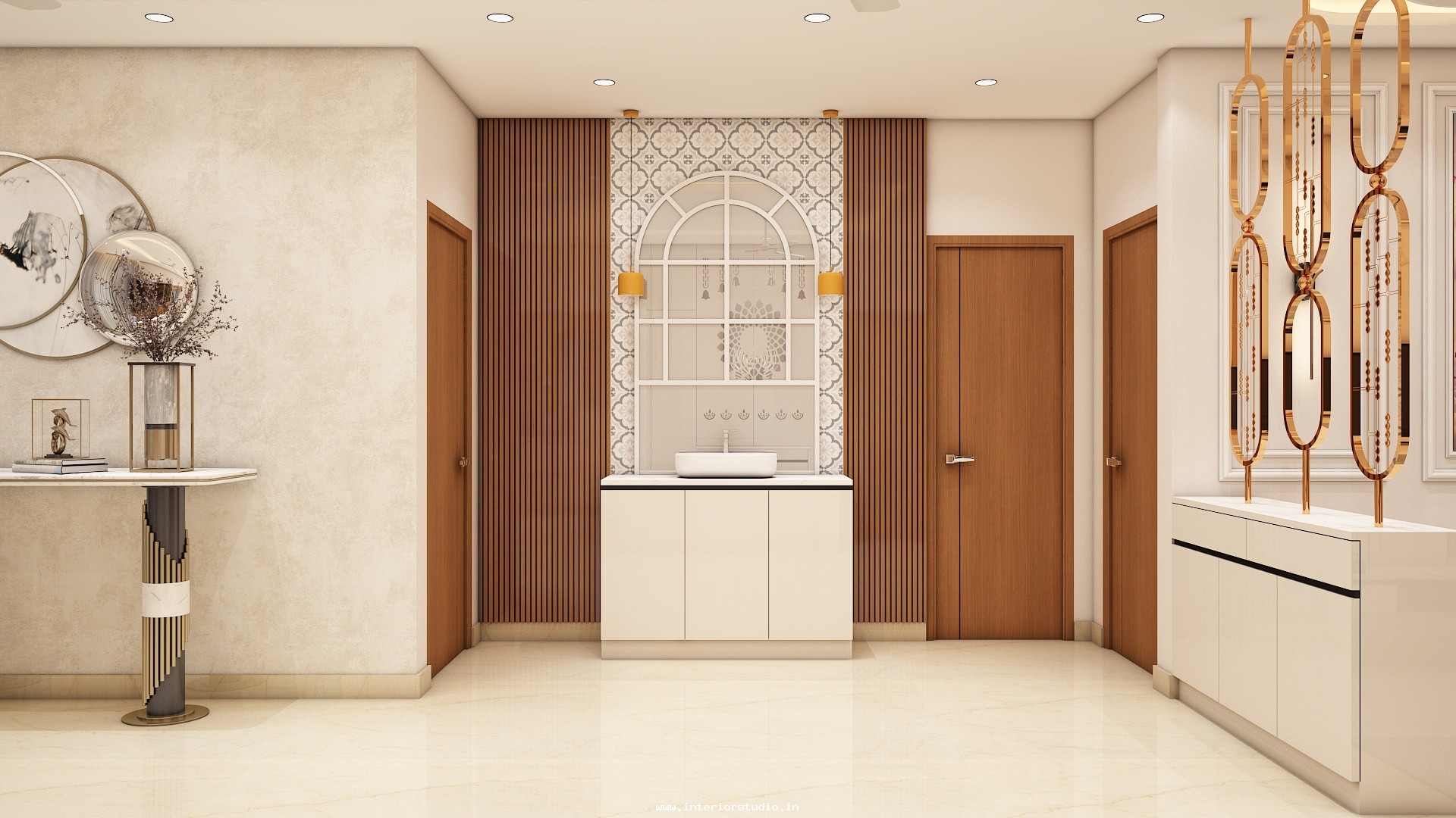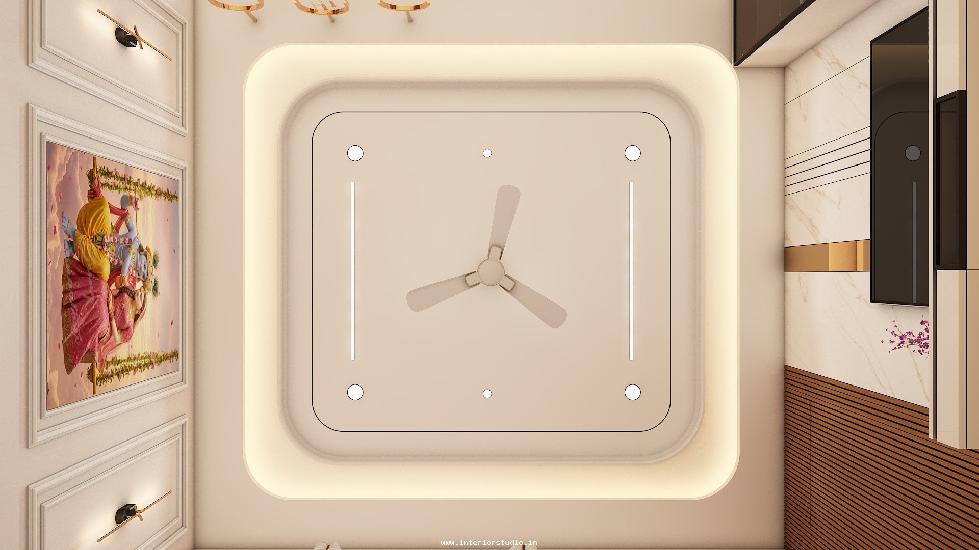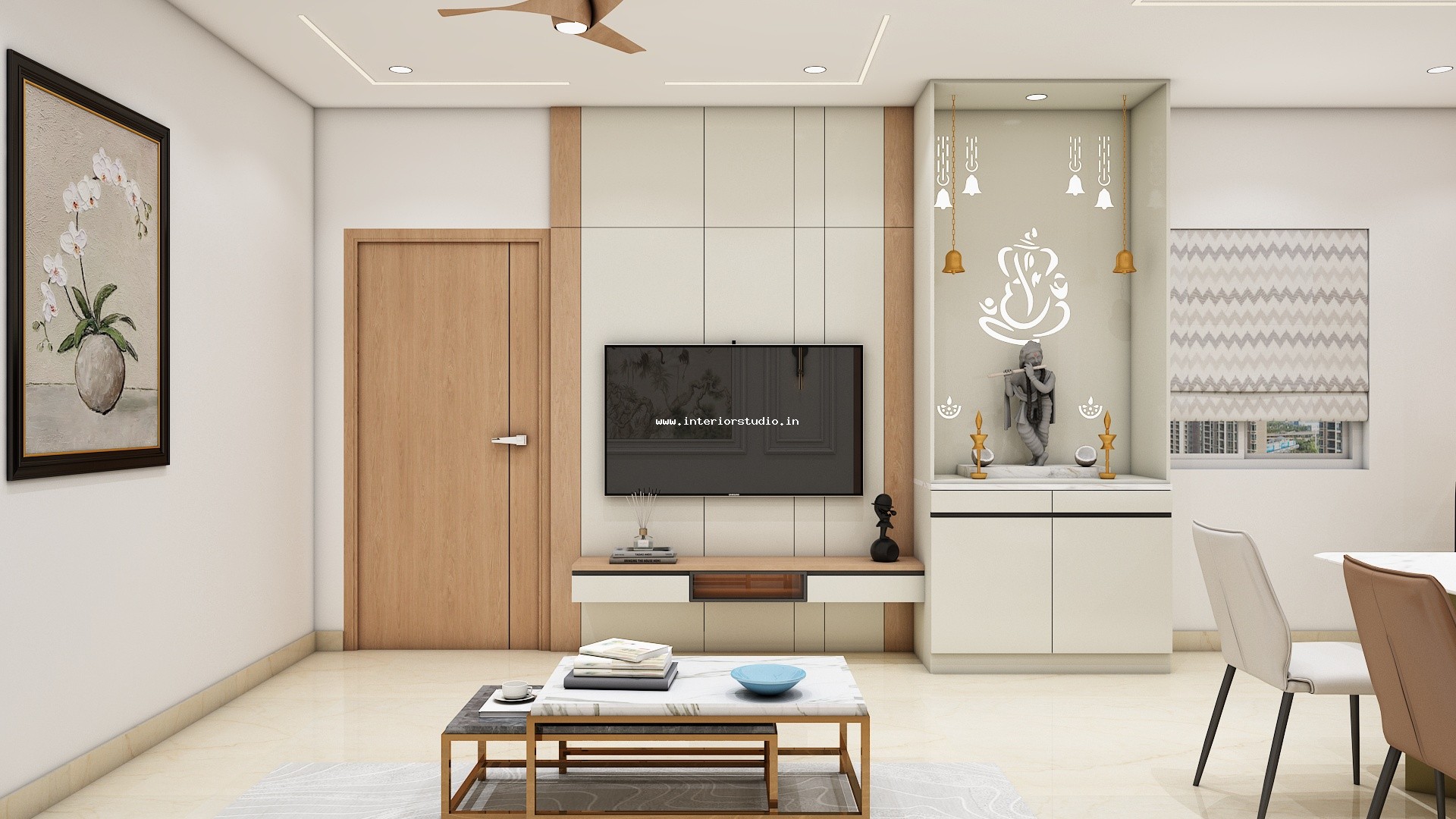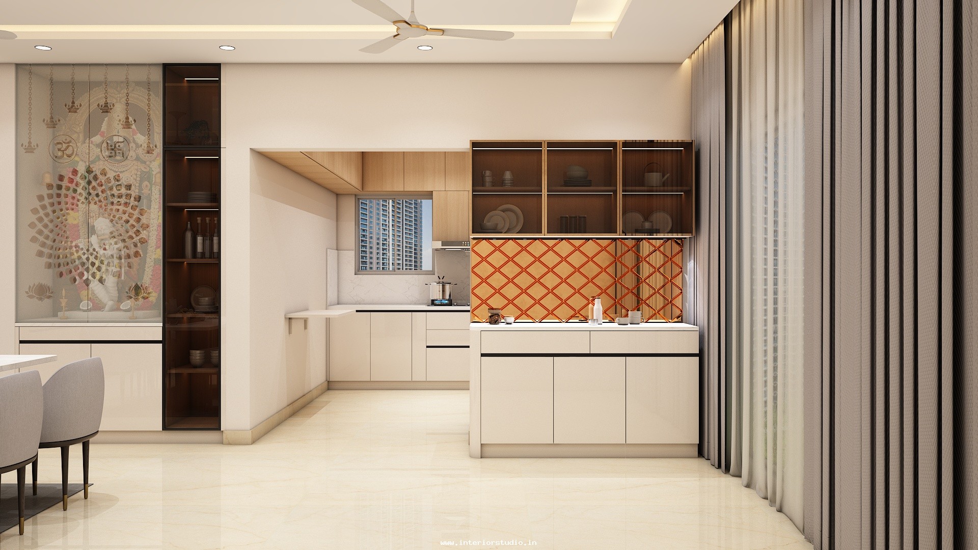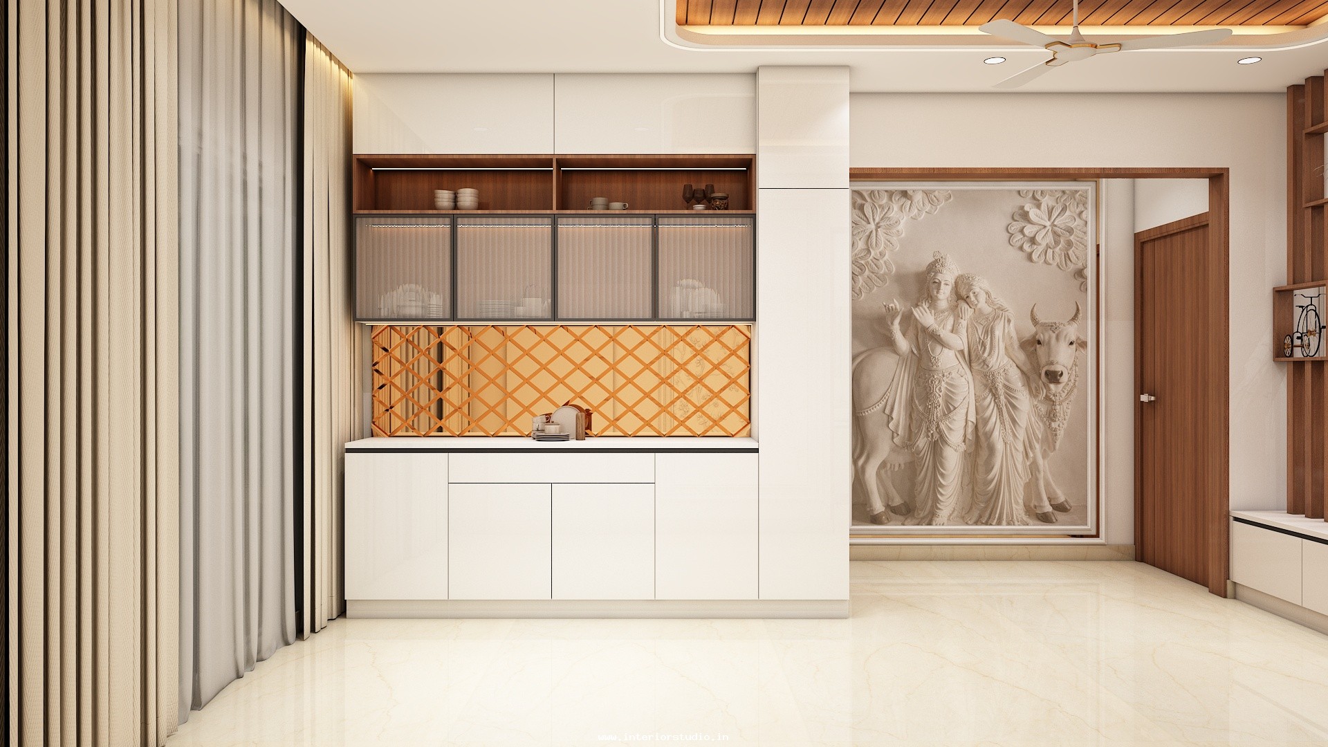 Pooja room is where we can find some peace of mind regularly at our homes. So, this room needs to get more space and a clean look to have a peaceful pooja everyday. Our 3D design of the Pooja room represents the Altar Setup with more space for idols, deity photos along with shelves for lamps and other pooja essentials. Also, lighting with LED backlights to bring the glow of pooja mandir, ventilation to make the fog from diyas to spread out along with speakers for playing chants or devotional music and traditional pooja items are added to the room making it more authentic.