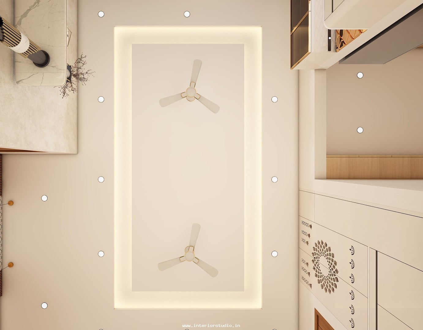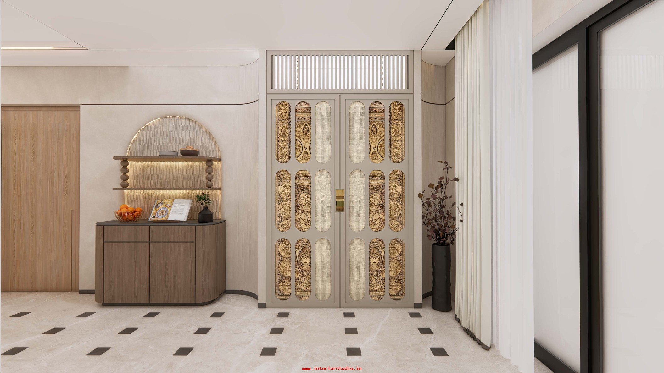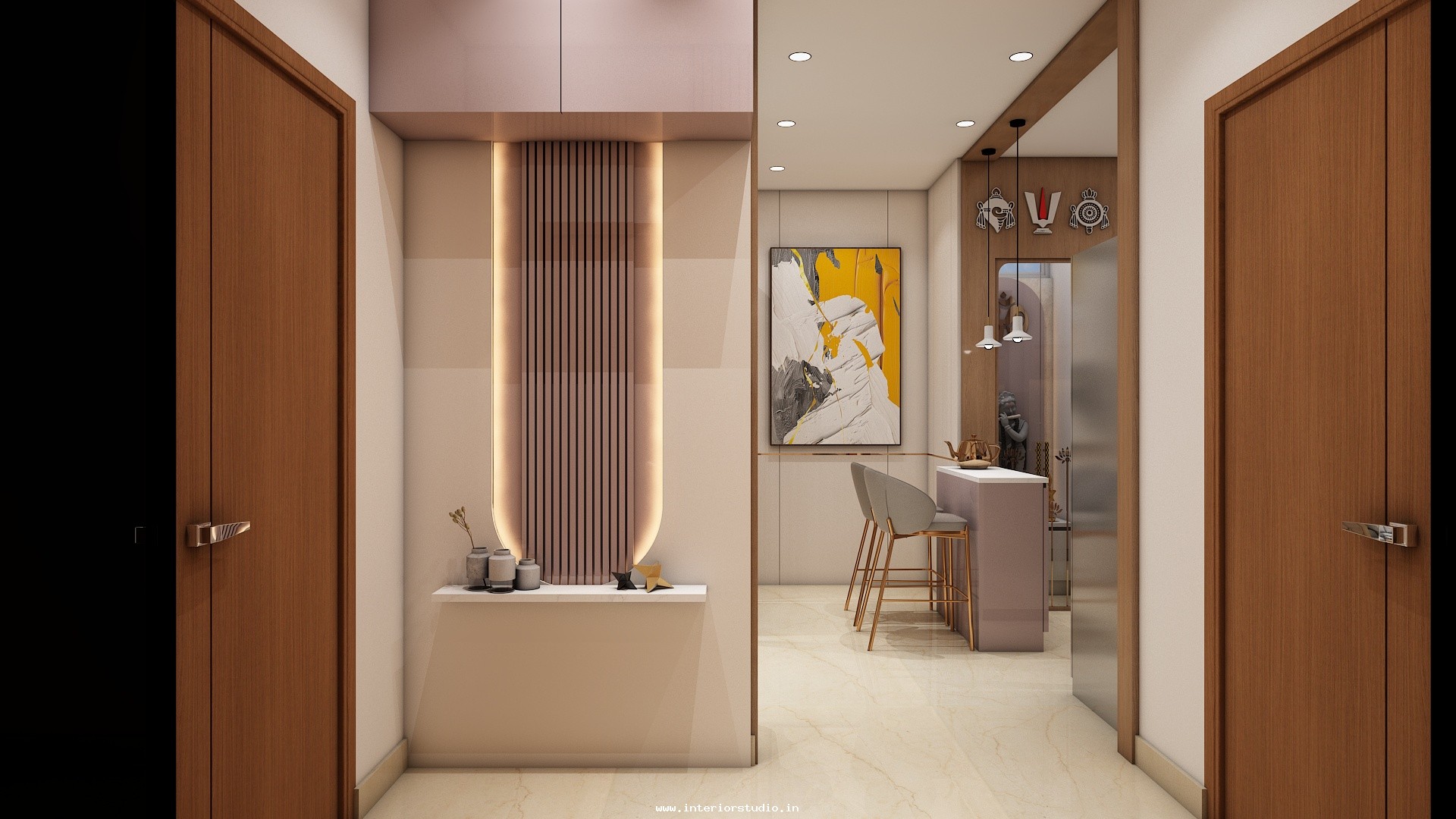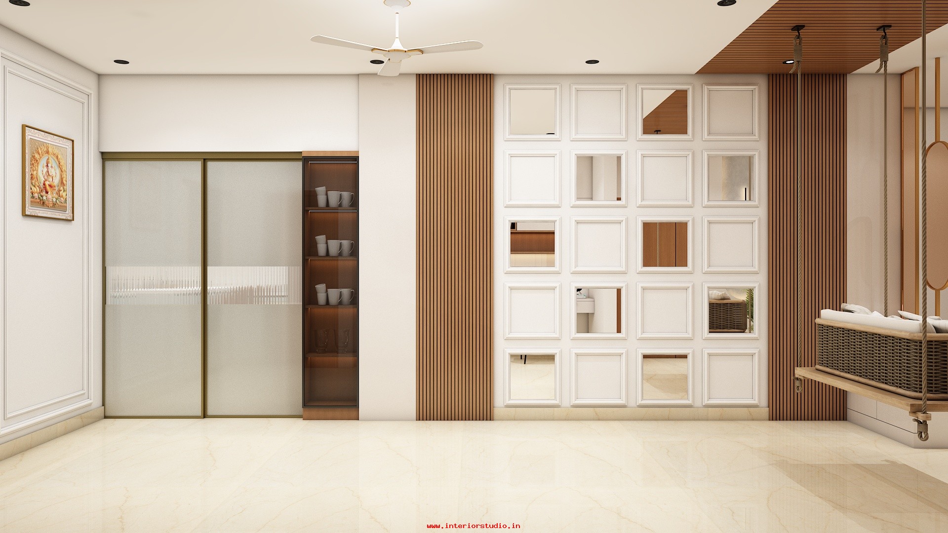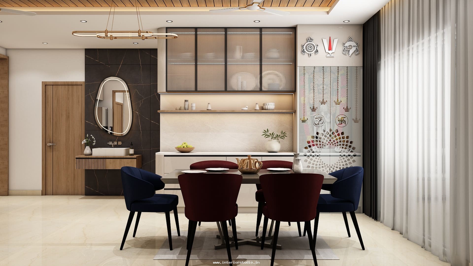 Pooja room is where we can find some peace of mind regularly at our homes. So, this room needs to get more space and a clean look to have a peaceful pooja everyday. Our 3D design of the Pooja room represents the Altar Setup with more space for idols, deity photos along with shelves for lamps and other pooja essentials. Also, lighting with LED backlights to bring the glow of pooja mandir, ventilation to make the fog from diyas to spread out along with speakers for playing chants or devotional music and traditional pooja items are added to the room making it more authentic.