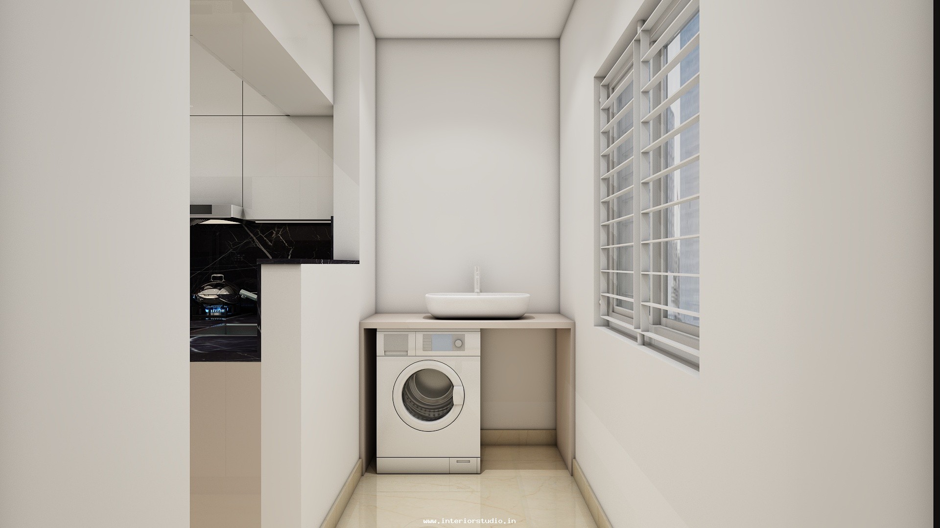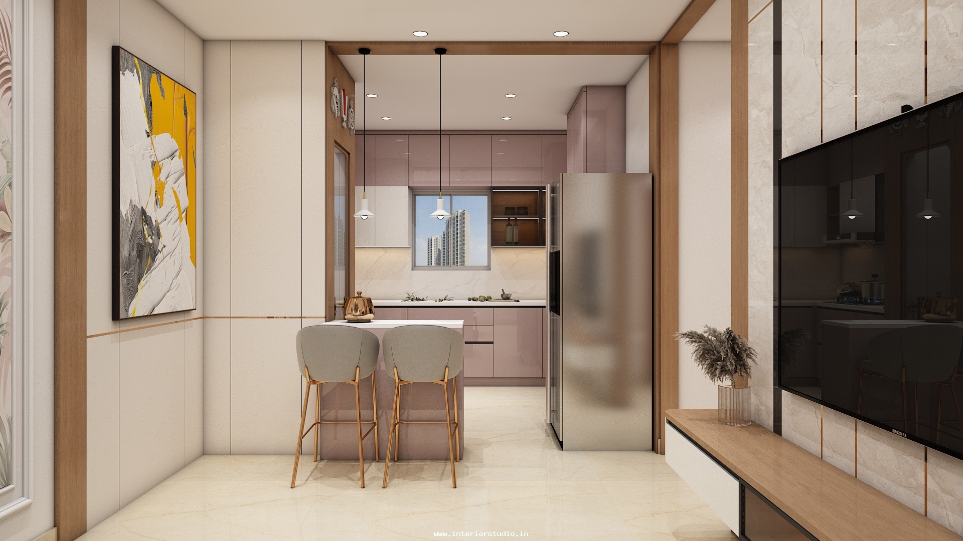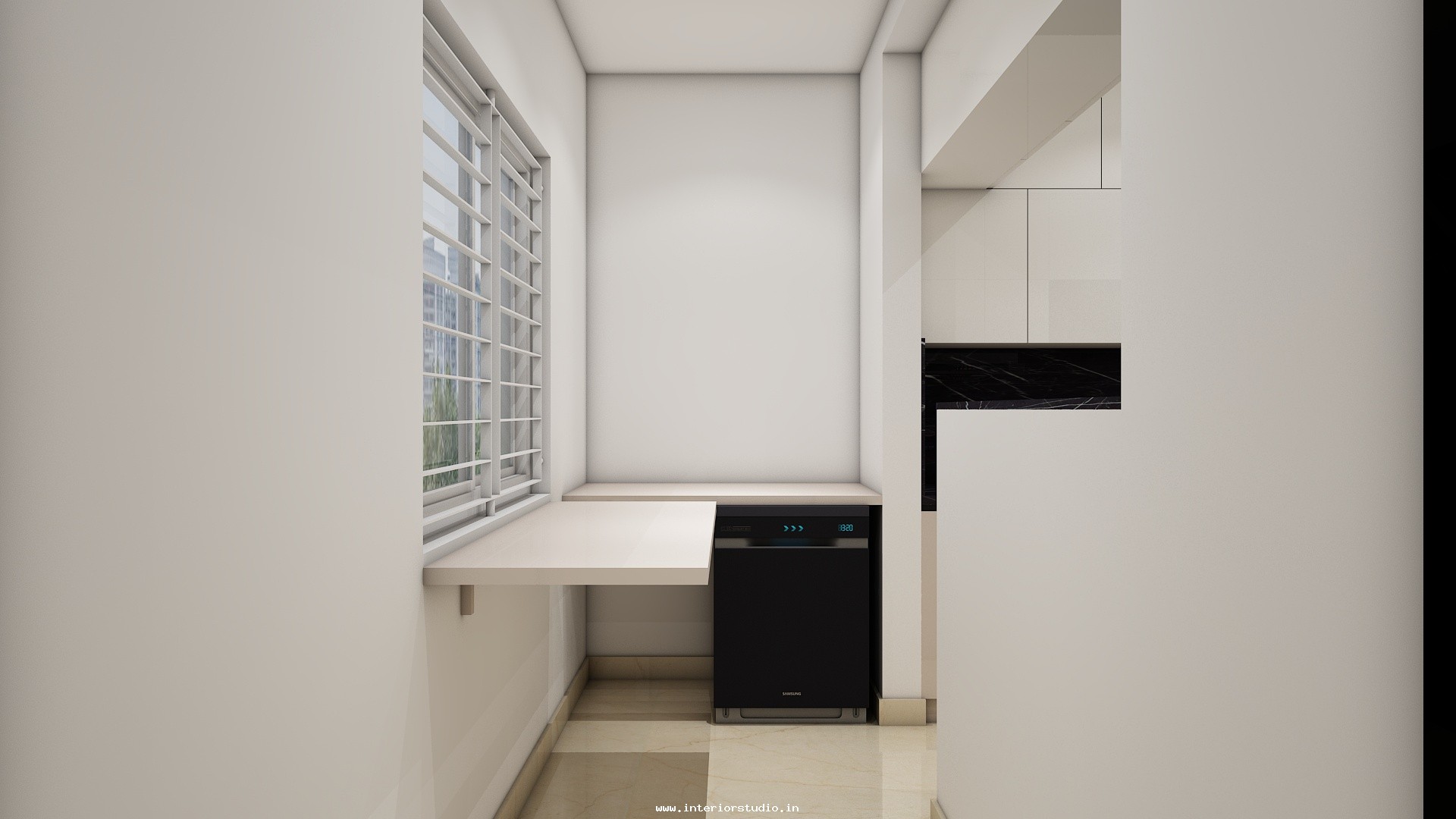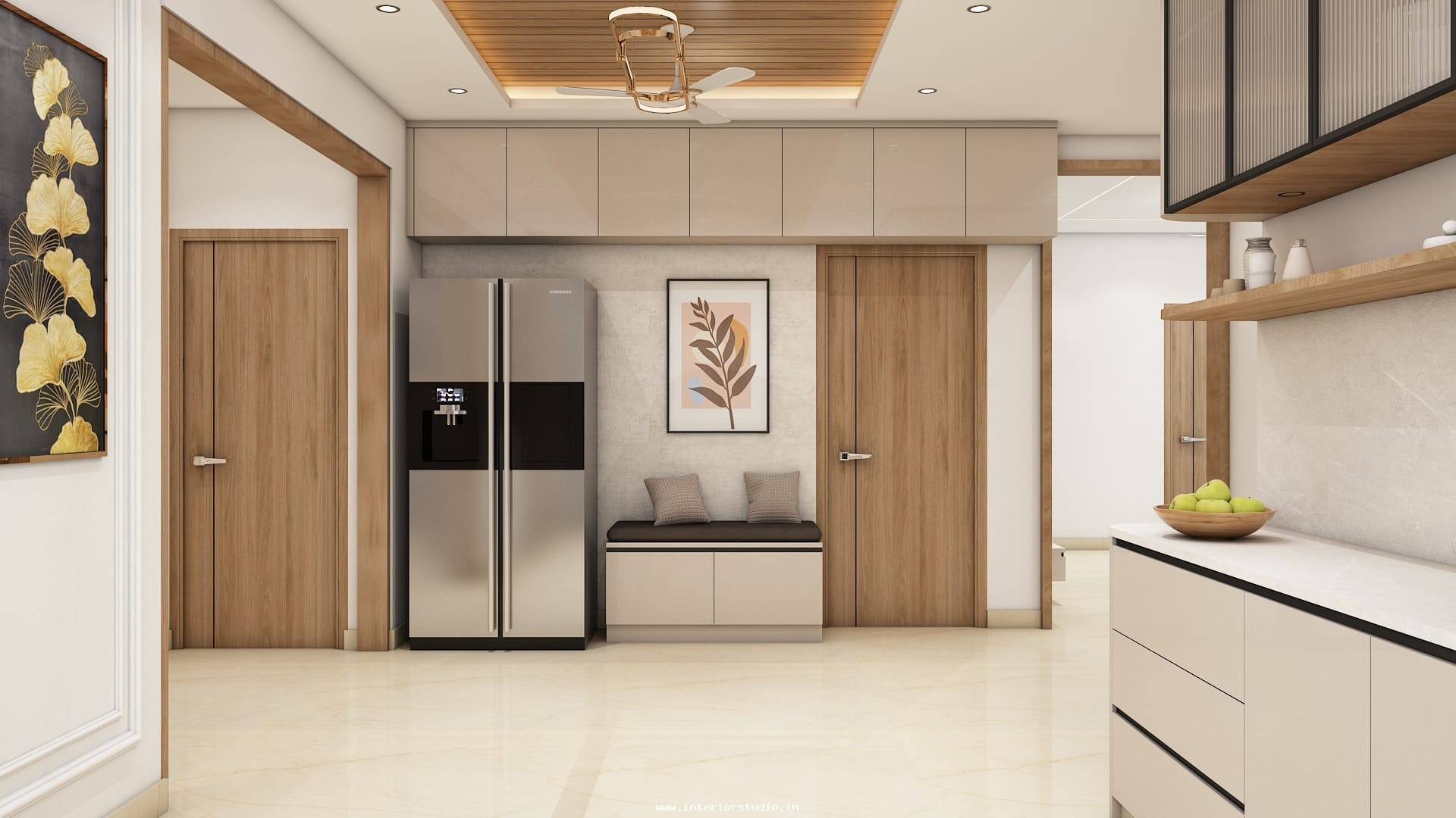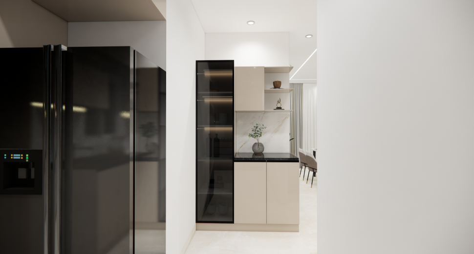 Kitchen needs more space for women to cook, clean and arrange groceries very neatly. Our 3D design represents the kitchen with perfect space use with appliance layout to place major appliances like fridge, oven, dishwasher etc, spacious counter space & cooking area for cooking, placing stove or induction cooktop, a chimney to spread out the smoke, cutting vegetables etc, cabinets & storage racks for storing kitchen utensils, cookware, groceries etc, a sink with drying area, ventilation & exhaust and the lighting through ceiling lights & lights under cabinets.