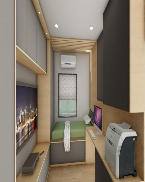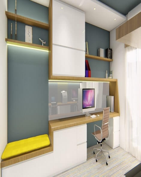 Study units can also saves up space making it more functional, we can design a wall-mounted set of drawers with unique style. Adding a study chair and multi-fucntional study table completes the whole look of study unit. Depending on the size of the room and your love for books we can also add more movable cabinets for smart storage of books or can also be used for stationery, office stuff. This is can be converted into your work desk amazingly setting up with movable ergonomic chair to comfort you and that fits perfectly with your lifestyle.