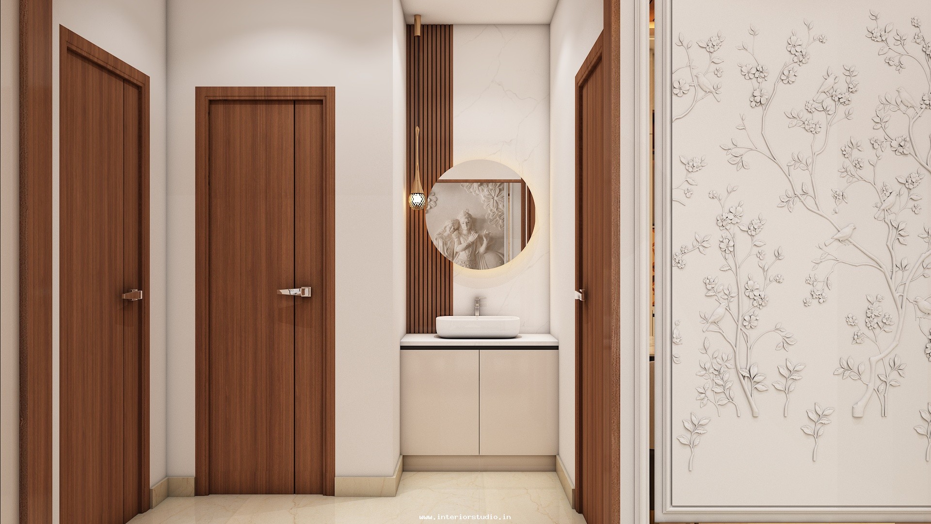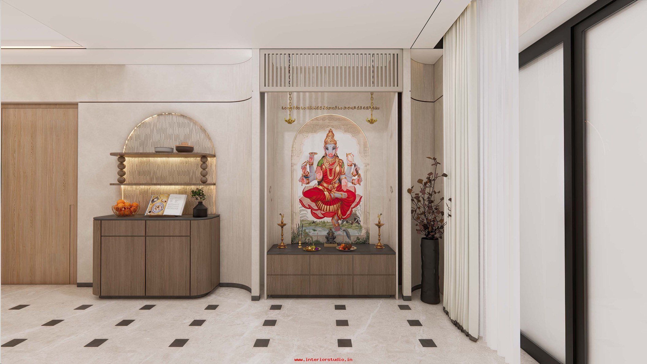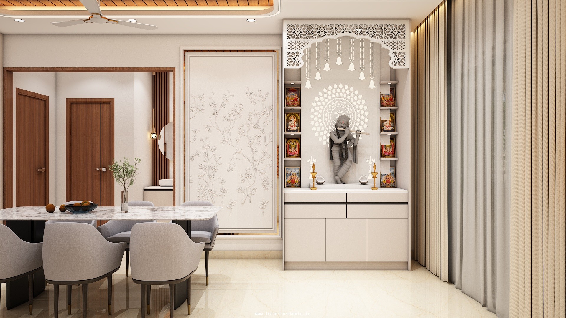 Pooja room is where we can find some peace of mind regularly at our homes. So, this room needs to get more space and a clean look to have a peaceful pooja everyday. Our 3D design of the Pooja room represents the Altar Setup with more space for idols, deity photos along with shelves for lamps and other pooja essentials. Also, lighting with LED backlights to bring the glow of pooja mandir, ventilation to make the fog from diyas to spread out along with speakers for playing chants or devotional music and traditional pooja items are added to the room making it more authentic.