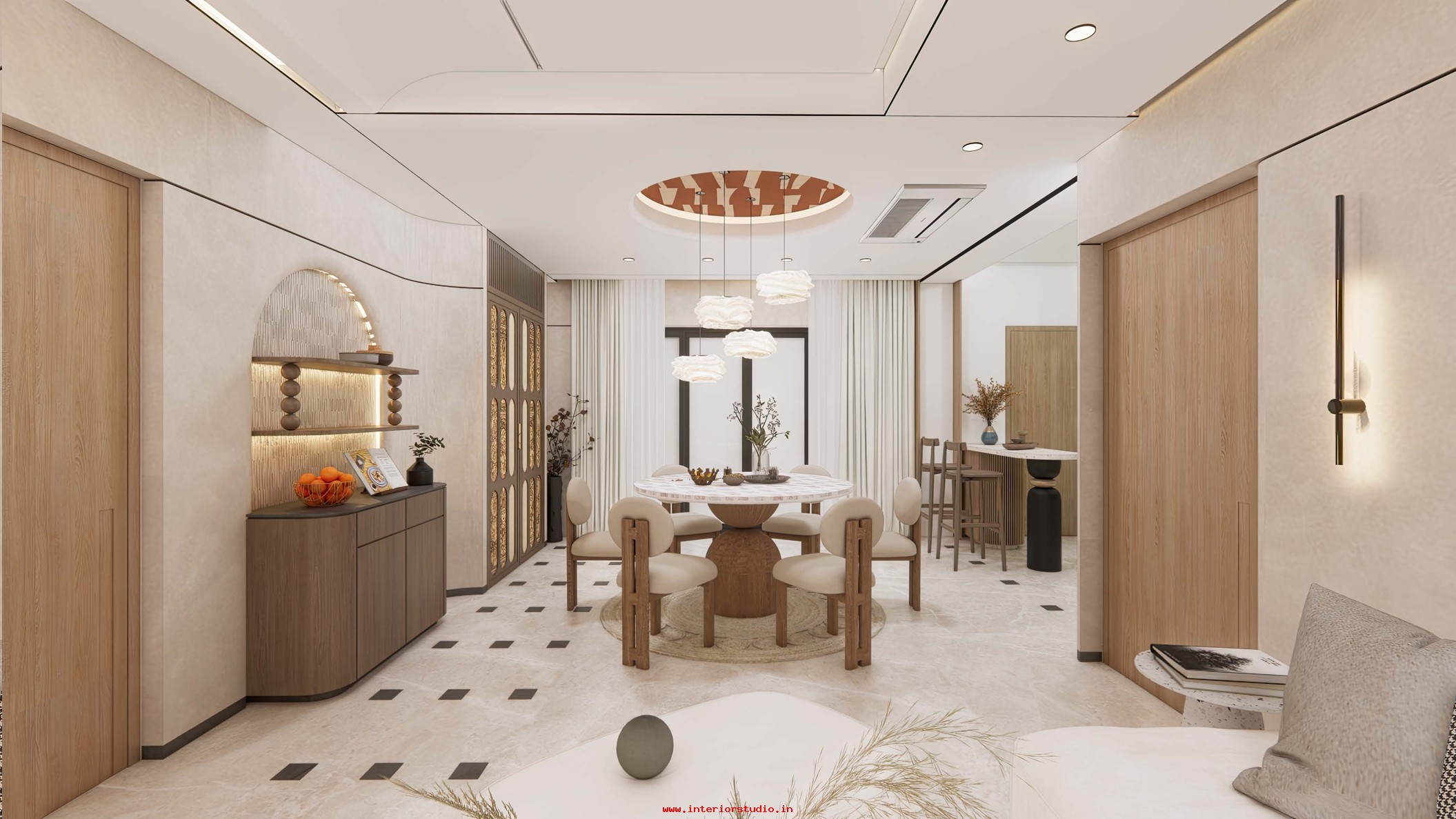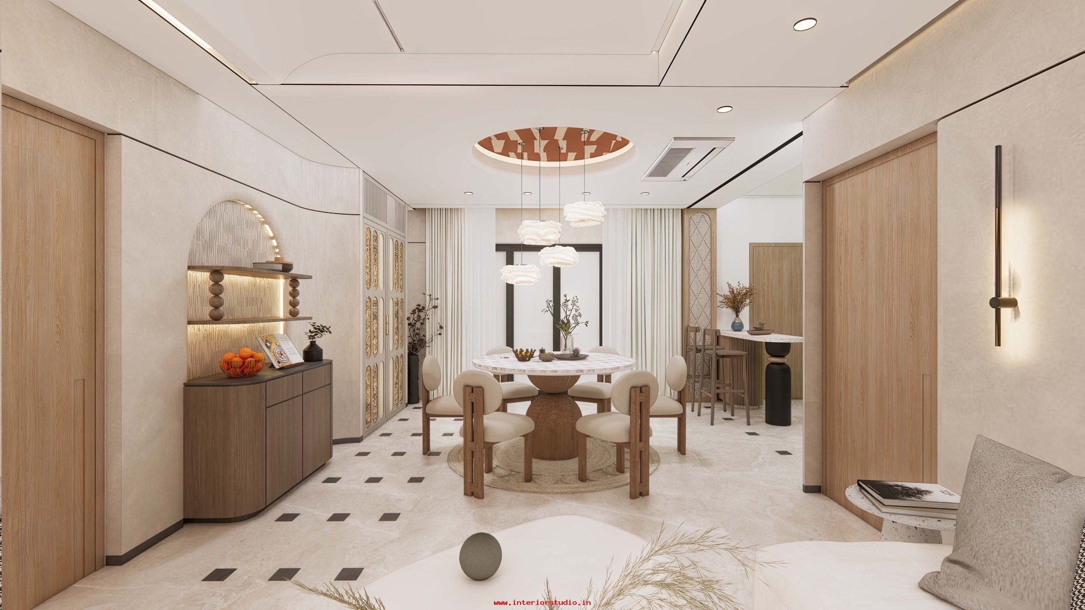 Dining room with perfect interior design can create more functional space for family gatherings. Our 3D interior design of dining room represents the detailed layout of the seating arrangement & dining table with round, rectangle and other styles. Lightings like pendant lights over the table create a warm ambiance, sideboard for buffet cabinet & storage of dinnerware and some other decorative items like wall art, mirrors etc. are included in our 3D design.