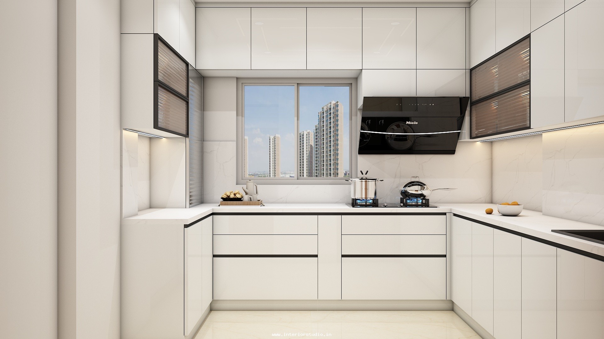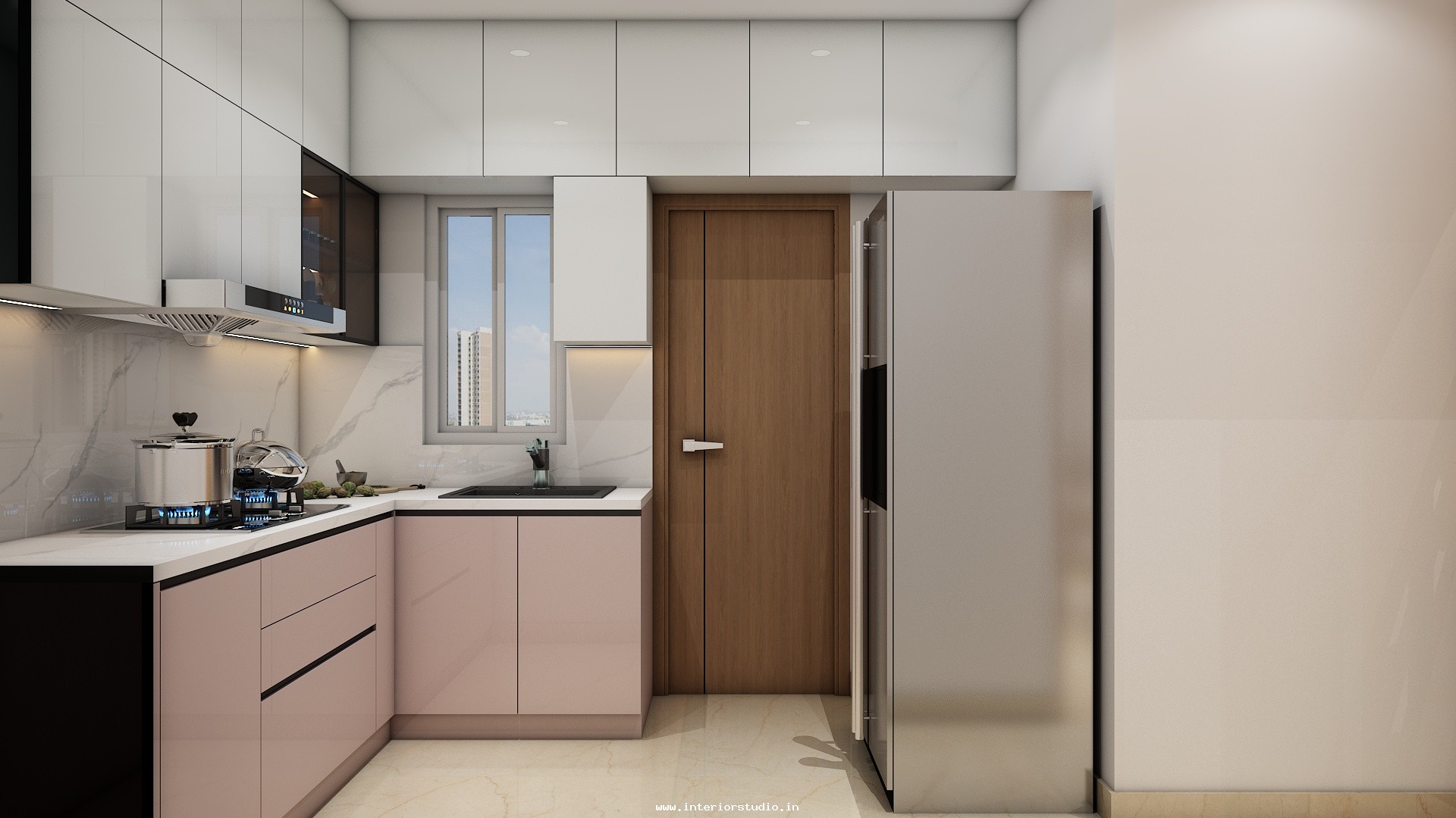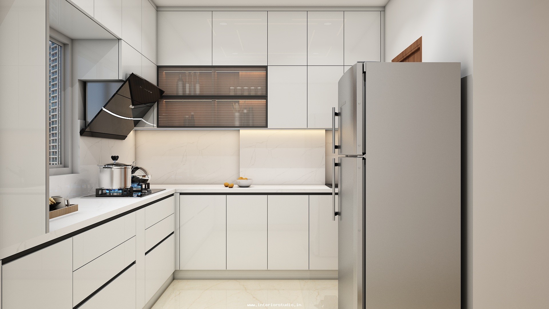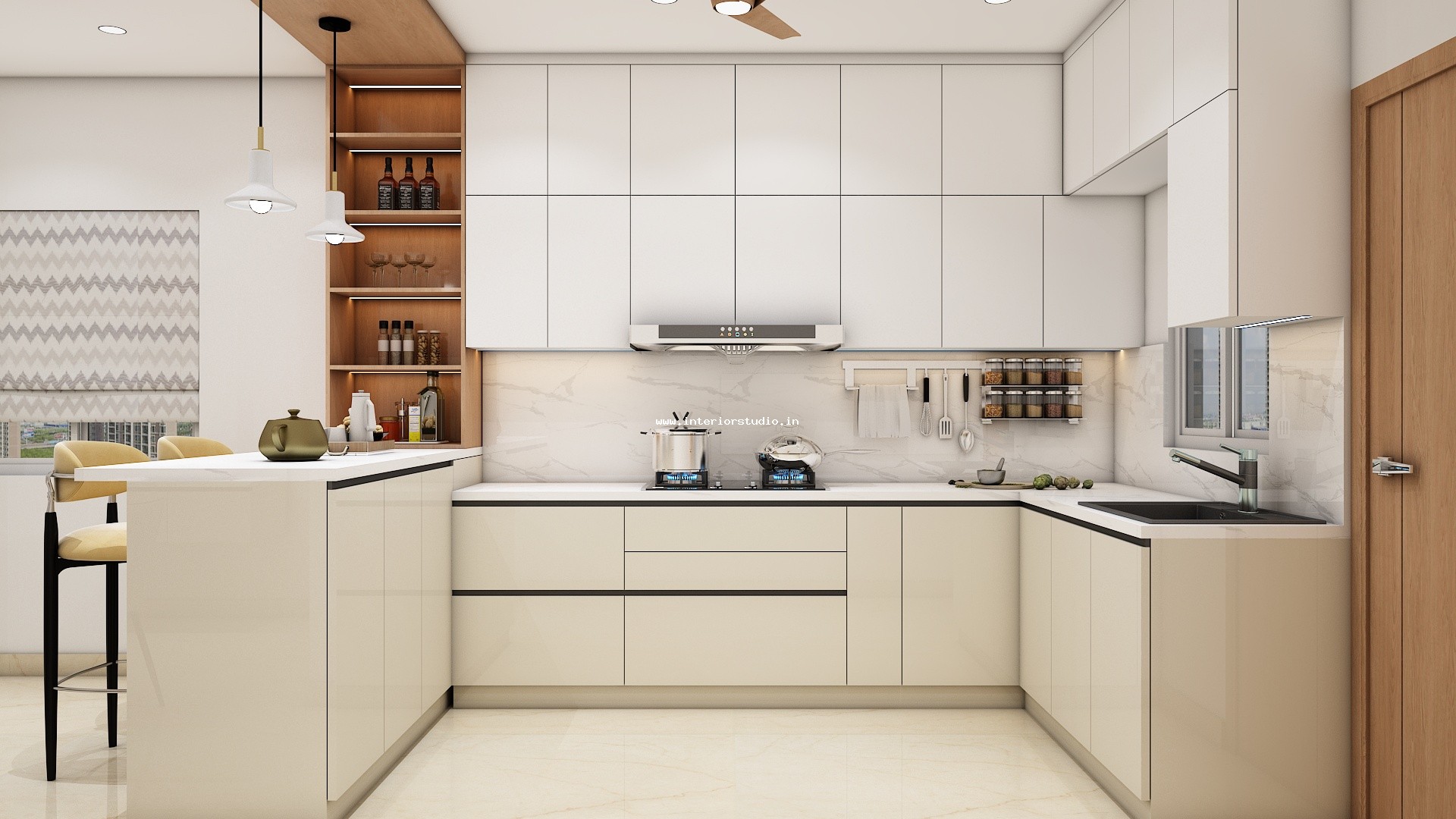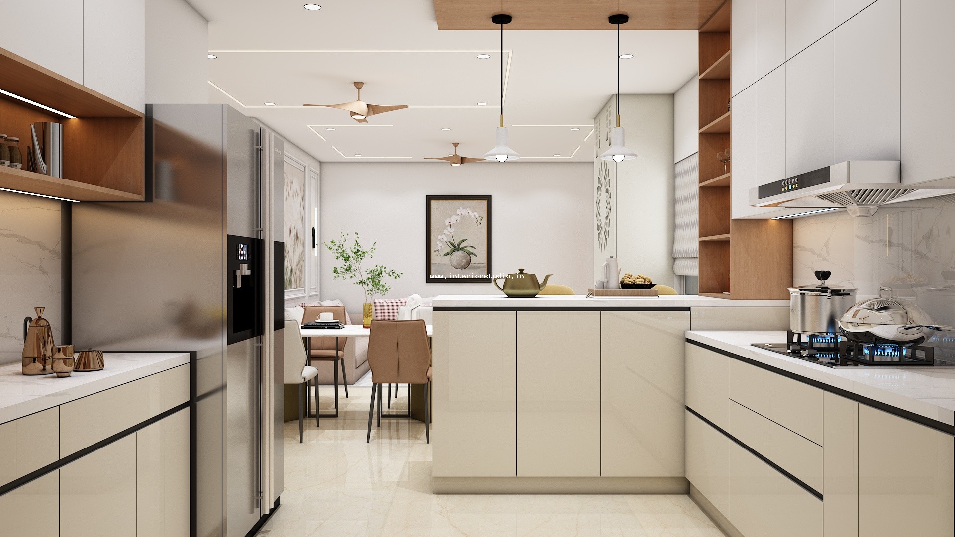 Kitchen needs more space for women to cook, clean and arrange groceries very neatly. Our 3D design represents the kitchen with perfect space use with appliance layout to place major appliances like fridge, oven, dishwasher etc, spacious counter space & cooking area for cooking, placing stove or induction cooktop, a chimney to spread out the smoke, cutting vegetables etc, cabinets & storage racks for storing kitchen utensils, cookware, groceries etc, a sink with drying area, ventilation & exhaust and the lighting through ceiling lights & lights under cabinets.
